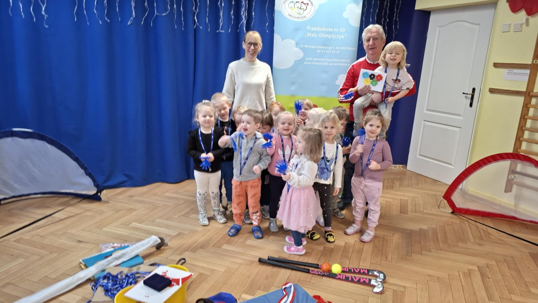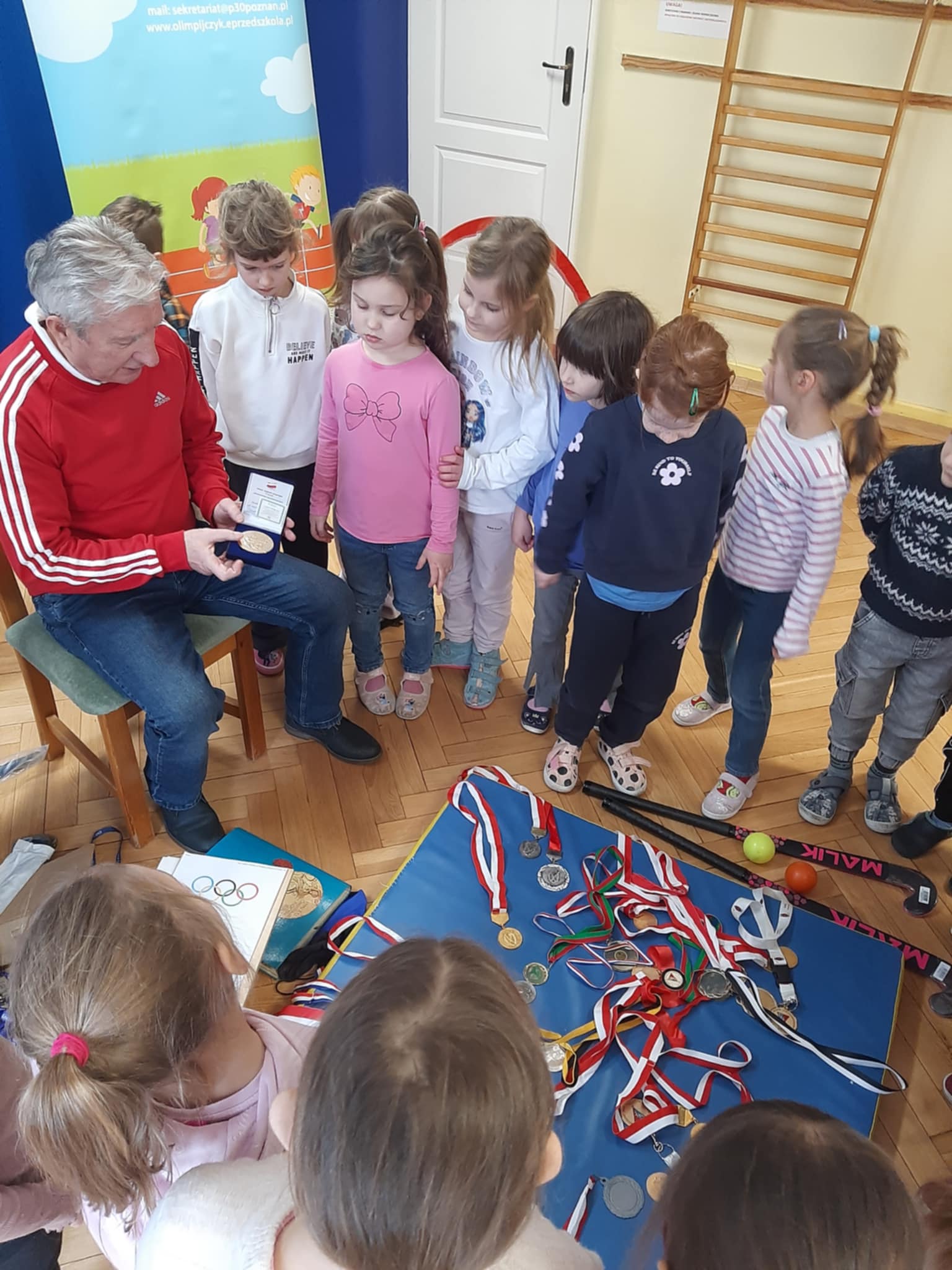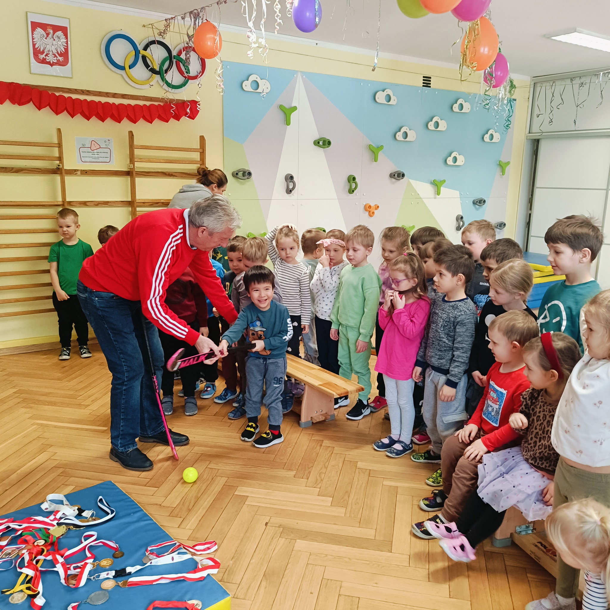 Pan Zbigniew opowiedział przedszkolakom o swojej karierze sportowej, osiągniętych sukcesach oraz trybie życia sportowca. Olimpijczyk zaprezentował dzieciom swoje najważniejsze medale oraz sprzęt sportowy. Nie zabrakło również pokazu umiejętności Pana Zbigniewa oraz wspólnego mini-treningu z dziećmi. Przedszkolaki także przygotowały miłe niespodzianki dla gościa – z dumą zaprezentowały hymn naszego przedszkola oraz obdarowały go własnoręcznie wykonanymi laurkami.